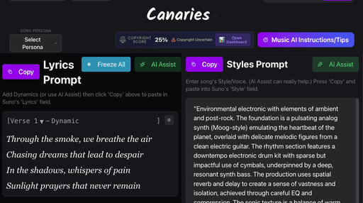 Generate prompts specifically tailored for AI Music Gen or prepare your song for Copyright or Rights registration.