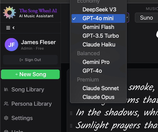 "I love being able to use my own Claude Sonnet subscription while using The Song Wheel AI so that I'm not paying for AI assistance in two different places. And I think Claude has more artistic suggestions than the less expensive AI models but I will admit that I'm biased; our work relationship has turned into something a little more personal. Please don't judge."