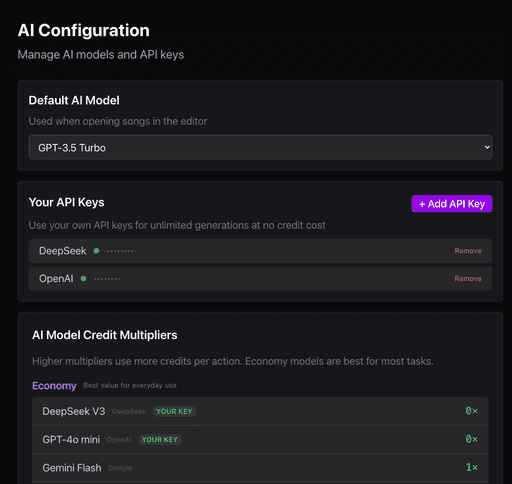 Using Artificial Intelligence models cost money; there's no avoiding that. However, many musicians already pay for a Pro version of ChatGPT, Claude, Gemini, Deepseek, etc. If you're one such Power User, then The Song Wheel AI allows you to enter in an API Key and you can leverage all the 'AI Assist' functions you want without burning any credits on our platform. Have more than one? Use all you have and compare!